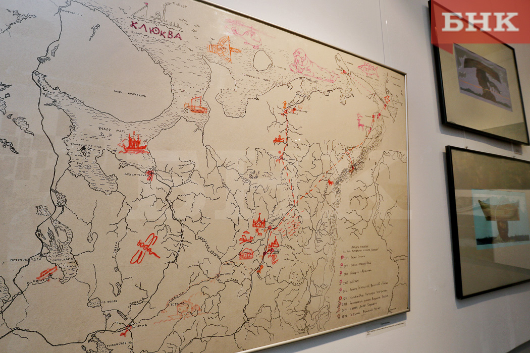 Выставка «Северный путь» постаралась уместить все девять лет пленэра в одном зале «Югора». Экспозиция начинается с карты, где отмечены все маршруты проекта с 2012 года – Онежье - Козловка, Онежье – Козловка - Отла, национальный парк «Югыд Ва», местечко Лемью и Дача писателей, Воркута - Вайгач, Нарьян-Мар – Пустозерск - Усть-Цильма, Визинга, Ижма – Диюр - Сизябск, Тотьма - Великий Устюг.